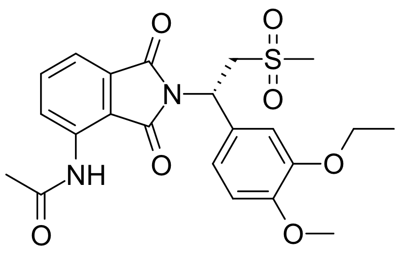 Apremilast is an inhibitor of phosphodiesterase 4 (PDE4) that is clinically used to treat psoriasis and psoriatic arthritis. Apremilast exhibits anti-inflammatory and immunomodulatory activities, increasing levels of cAMP and IL-10 and decreasing levels of iNOS, IL-23, and TNF-α in vitro and in vivo. An analog of thalidomide.