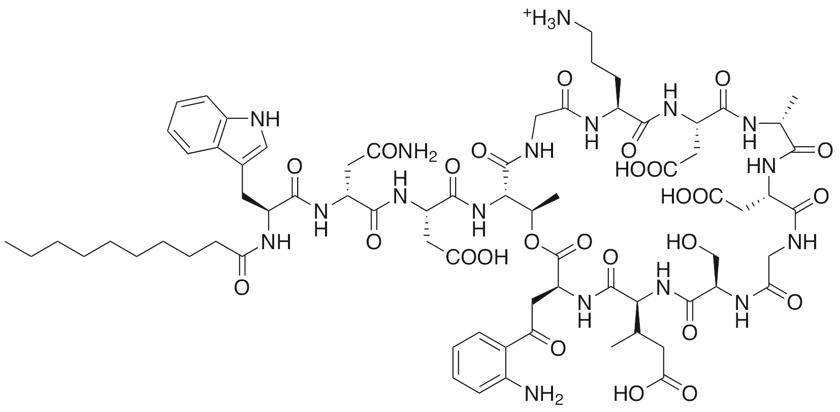 Daptomycin is an anionic lipopeptide antibiotic that exhibits antibacterial efficacy and is used clinically to treat gram positive bacterial infections such as MRSA. Daptomycin induces reorganization of cell membranes and alters localization of proteins involved in cell division and cell wall synthesis; this compound also induces release of intracellular Ca2+ and other ions. This compound is also produced by the soil saprotroph Streptomyces roseosporus.