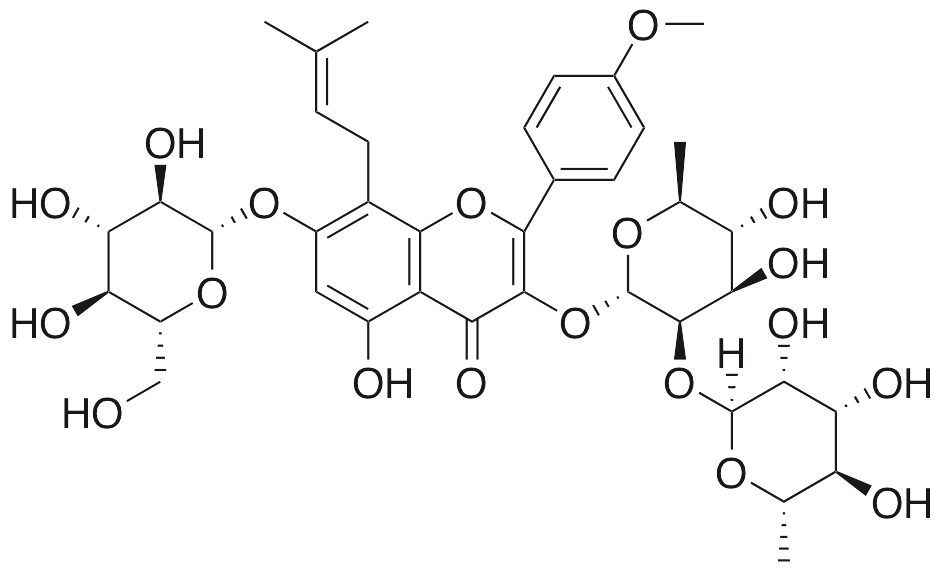 Epimedin C is a flavonoid originally found in Epimedium sagittatum; it exhibits immunostimulatory and anticancer activities. In hepatoma cells, epimedin C inhibited cellular proliferation by decreasing expression of c-Myc, cyclin D1, and c-fos, and increasing expression of CDK inhibitors p21 and p27. In a mouse model of hydrocortisone acetate-mediated immunosuppression, epimedin C enhances lymphocyte proliferation and increases IL-2 production.