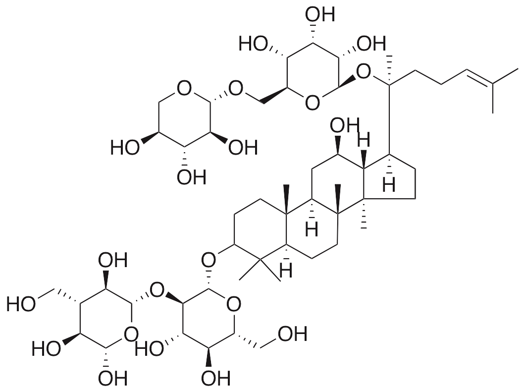 Ginsenoside Rb3 is a triterpene saponin originally found in species of Panax (ginseng) that exhibits cardioprotective, antioxidative, antidepressant, and anti-diabetic activities. Ginsenoside Rb3 inhibits contractions in aortic rings and suppresses expression of ROS, NOX-2, and NOX-4, decreasing oxidative stress and improving endothelial function. In diabetic mice, ginsenoside Rb3 decreases blood glucose levels and improves oral glucose tolerance. Ginsenoside Rb3 also decreases immobility time in the forced swim, tail suspension, and learned helplessness tests. Additionally, this compound decreases levels of malondialdehyde and increases activity of superoxide dismutase, decreasing infarct size in animal models of myocardial ischemia/reperfusion.