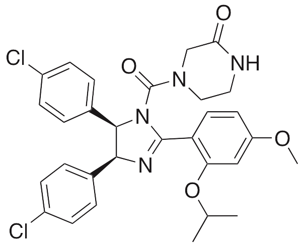 Nutlin-3 is an imidazoline inhibitor of MDM2, preventing the interaction between MDM2 and p53. Nutlin-3 exhibits anticancer chemotherapeutic and anti-diabetic activities. Nutlin-3 increases production of ROS, activation of ERK1/2, p38 MAPK, and JNK, and increases expression of heme oxygenase 1 (HO-1) in colon cancer cells and osteosarcoma cells; similarly, it induces apoptosis in hepatocellular carcinoma cells. Nutlin-3 also inhibits the epithelial-to-mesenchymal transition (EMT), inhibiting phosphorylation of Smad2/3, suppressing cell motility, and enhancing the efficacy of other chemotherapeutics in animal models. In animal models of diabetes, this compound attenuates the effects of the disease, decreasing weight loss, increasing IL-12 production, and lowering rates of hyperglycemia.
