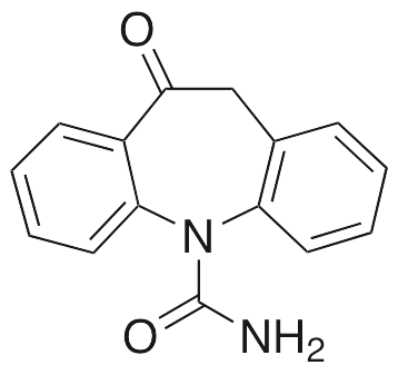 Oxcarbazepine (OX) is an antiepileptic/anticonvulsant commonly used to treat epilepsy, but also exhibits activity as a treatment for mood disorders and neuropathic pain as well. Administration of oxcarbazepine leads to a reversible reduction in current amplitude from voltage-gated Na+ channels and may suppress current amplitude of delayed rectifying K+ channels; this reduces the amplitude of action potentials and prolongs their duration. This compound also inhibits Na+ channel-dependent Glu release and produces a moderate open channel block on nicotinic acetylcholine receptors (nAChRs), preventing deactivation. Interestingly, oxcarbazepine may have potential as a treatment for substance abuse disorders, as it is moderately effective as a relapse prevention treatment in a clinical trial of recently abstinent alcohol-dependent subjects.